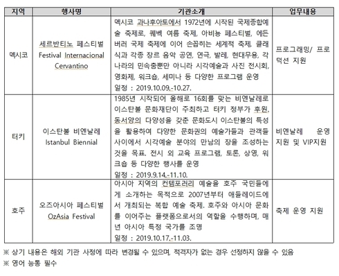 경력 3년 미만의 신진인력은 세계적 축제로 손꼽히는 멕시코의 ‘세르반티노 페스티벌’, 호주의 ‘오즈아시아 페스티벌’, 터키의 ‘이스탄불 비엔날레’ 등 해외 주요 문화행사에 실습 직원으로 참여해 국제 문화예술 행사가 어떻게 운영되는지 직접 체험하고 실습할 기회를 얻는다.