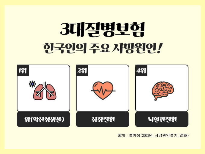 (비전21뉴스) 한국인의 주요 사망원인중에 암, 뇌혈관질환, 심혈관질환은 흔히 3대질병이라 일컬어지며 살아가면서 가장 먼저 대비해야 하는 중대질병으로 항상 강조되고 있다. 이들 질병에 미리 대비하기 위해 가입하는 것이 진단비보험인데, 이러한 3대질병진단비를 중점으로 보장하는 보장성보험이 3대진단비보험 이다. 3대질병진단비보험은 각각의 질병에 주목해서 보장하기도 하지만, 나에게 맞는 추가 특약을 잘 골라서 가입한다면 종합건강보험으로도 충분히 활용도가 높다.