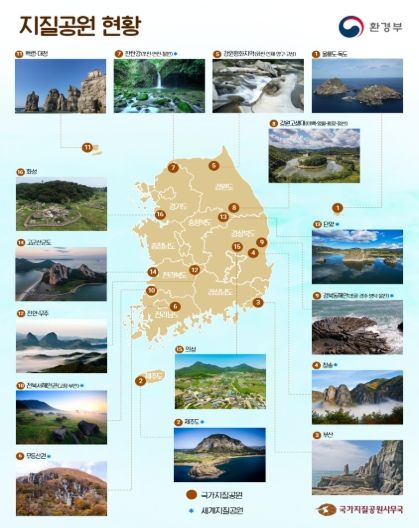 지질공원이란, 지구과학적으로 중요하고 경관이 우수한 지역으로, 이를 보전하고 교육․관광 사업 등에 활용하기 위해 환경부장관이 인증한 공원을 뜻하며, 올해(2025년) 8월 말 기준으로 전국에 16곳의 지질공원이 있다.