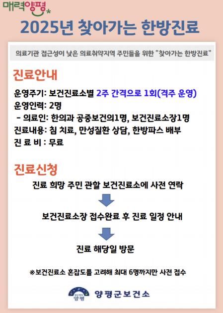 ‘찾아가는 보건진료소 한방진료’는 관할 지역 보건진료소를 통한 사전 예약제로 운영되며, 양평군민 누구나 이용이 가능하다. 운영 일정 및 신청 관련 자세한 사항은 양평군보건소 보건정책과로 문의하면 된다.