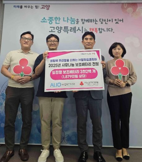 고양시 덕양구 대덕동에 소재한 ㈜알리오코리아는 IT전자제품 전문 제조기업으로, 외출이나 여행에도 안심할 수 있도록 일상생활 속에서 꼭 필요한 제품인 보조배터리를 기탁했다.