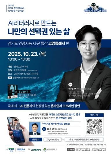 (비전21뉴스) 고양특례시는 경기도와 경기과학원이 주최하는 ‘2025년 인공지능 시군특강(고양특례시편)’을 10월 23일 마두도서관에서 진행한다고 밝혔다.