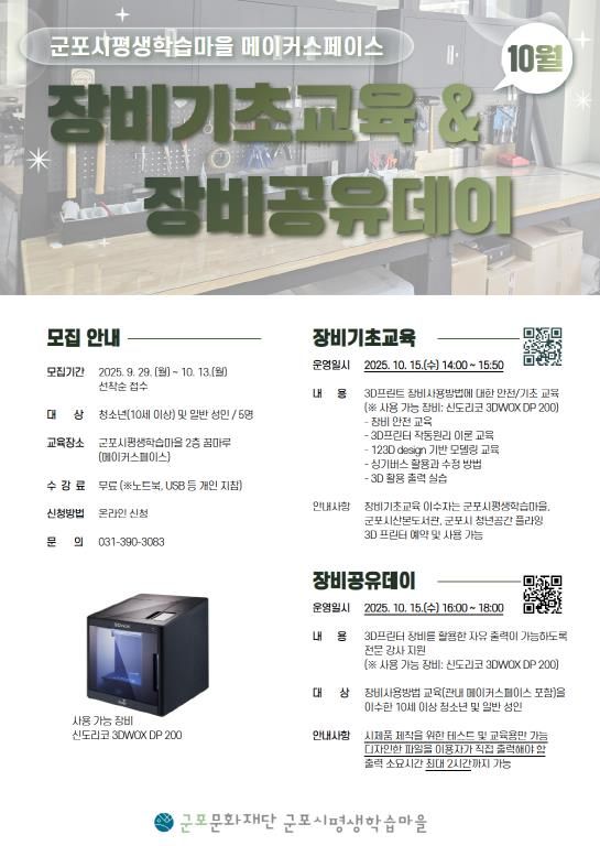 (비전21뉴스) (재)군포문화재단은 오는 10월 15일, 지역 청소년과 성인을 대상으로 디지털 제작 장비를 활용한 ‘3D프린터 장비기초교육’과 ‘장비공유데이’를 운영한다.