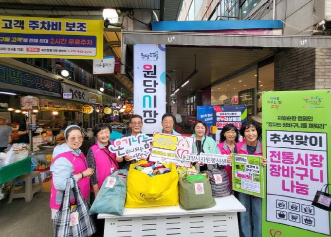 이번 캠페인은 고양시 자원봉사자들이 자원순환 의미를 담은 라벨을 부착해 새롭게 탄생시킨 400여 개의 장바구니를 원당전통시장 방문객에게 무료로 배부하는 방식으로 진행됐다.