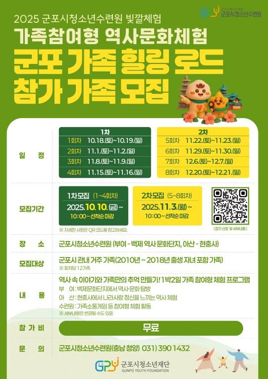 (비전21뉴스) 군포시청소년재단이 운영하는 군포시청소년수련원(충남 청양)은 관내 가족을 대상으로 2025년 가족참여형 역사문화탐방 '군포가족 힐링로드' 참가자를 모집한다.