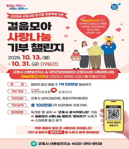 (비전21뉴스) 군포시 산본보건지소는 오는 10월 13일부터 31일까지(19일간) 국민건강보험공단 군포지사와 함께하는 '걸음모아 사랑나눔' 기부챌린지를 운영한다.
