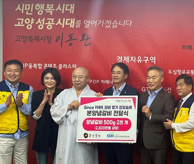 (비전21뉴스) ㈜전한의 외식브랜드 강강술래(대표 노상환)가 10월 10일, 고양특례시에 본양념갈비 500g 2,000개(2,820만 원 상당)를 기탁했다. 이번 전달식은 고양특례시청 열린시장실에서 진행됐으며, 이동환 고양특례시장, 김민숙 고양특례시의원(고양, 관산, 원신), 노상환 강강술래 대표, 김응화 고양시사회복지협의회 회장이 함께 자리했다.