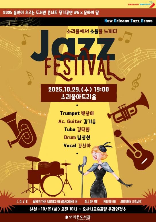 (비전21뉴스) 경기도 오산시는 오는 10월 29일 오후 7시, 소리울도서관 3층 소리울아트리움에서 '2025 음악이 흐르는 도서관 콘서트 정기공연 #6 × 문화의 달 – Jazz Festival; 소리울에서 소울을 느끼다'를 개최한다고 밝혔다.