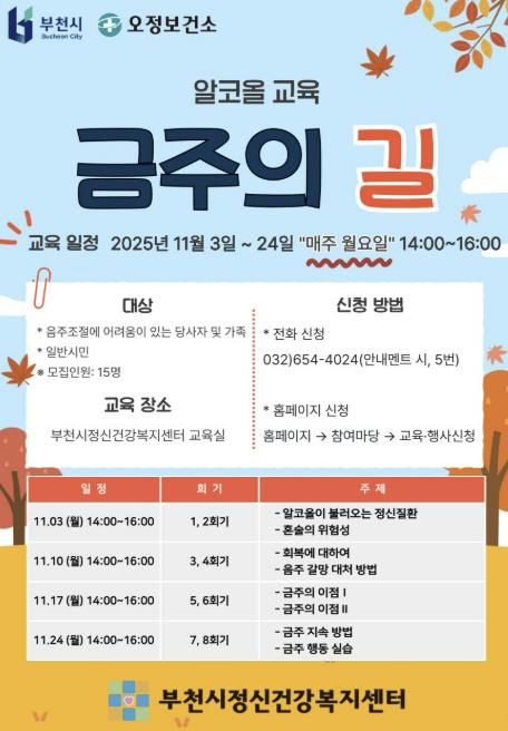 참여 대상은 알코올 사용장애를 겪는 당사자와 가족, 일반 시민 등 누구나 가능하며, 모집 인원은 15명이다. 신청은 10월 31일까지 부천시정신건강복지센터 홈페이지 또는 전화를 통해 선착순으로 접수하며, 참가비는 무료다.