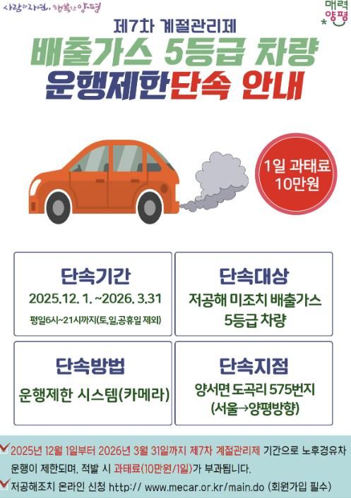 (비전21뉴스) 양평군(은 오는 12월 1일부터 2026년 3월 31일까지 제7차 미세먼지 계절 관리제 시행에 따라 배출가스 5등급 차량에 대한 운행 제한 단속을 시행한다고 밝혔다.