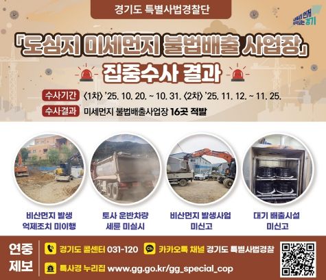 (비전21뉴스) 경기도는 도심지 미세먼지 발생사업장 330개를 대상으로 불법 배출 행위를 집중 수사해 대기환경보전법 위반 사업장 16개를 적발했다고 9일 밝혔다.