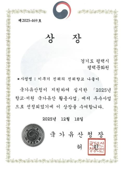 (비전21뉴스) 평택문화원은 12월 18일 대전 전통나래관 다목적강당에서 열린 국가유산청 주최 ‘2025 우리고장 국가유산 활용 우수사업 시상식’에서 평택문화원의 ‘이무기 진위의 진위향교 나들이’가 우수사업(국가유산청장상)으로 수상했다.