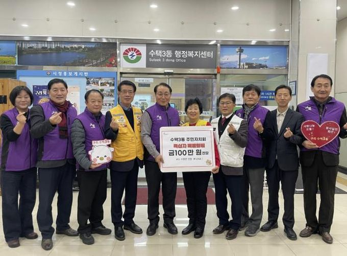 이영열 주민자치회장은 “이번 특별회비가 지역에서 도움이 필요한 이웃들에게 따뜻한 희망이 되길 바란다.”라고 말했다. 홍종민 수택3동장은 “따뜻한 사회 구현을 위해 나눔을 실천해 주신 수택3동 주민자치회에 감사드리며, 앞으로도 지속적인 나눔 문화 확산을 위해 행정복지센터에서도 적극 지원하겠다.”라고 밝혔다.
