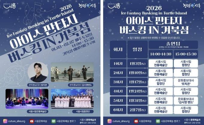 (비전21뉴스) 시흥시는 지난 연말에 진행된 ‘2025 시흥 사운드 오브 윈터’의 열기를 잇는 후속 문화예술 프로그램으로, 겨울철 거북섬을 찾는 시민과 관광객에게 풍성한 즐길 거리를 제공하고자 ‘2026 아이스 판타지 버스킹 인 거북섬’을 운영한다.