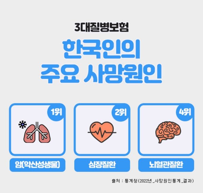 (비전21뉴스) 3대질병으로 일컬어지는 암, 뇌혈관질환, 심혈관질환은 한국인의 주요 사망원인에서 상위를 차지하고 있으며, 이에 대한 진단비를 집중적으로 보장해 주는 보험상품을 3대질병진단비 보험이라 할 수 있다.