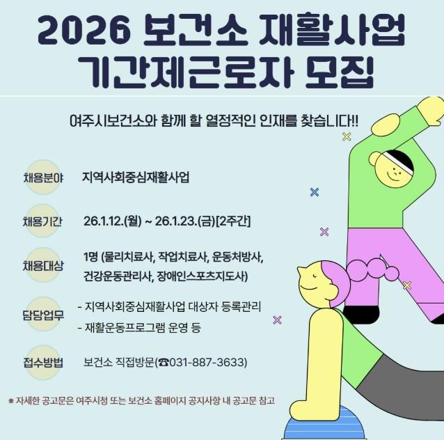 (비전21뉴스) 여주시보건소는 지역 내 등록장애인과 예비장애인들의 건강관리를 위한 지역사회중심재활사업 추진을 위해 1월 12일부터 1월 23일까지 2주간 기간제근로자 채용 공고를 실시한다.
