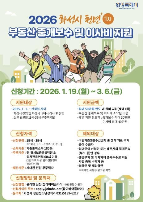 (비전21뉴스) 화성특례시가 19일부터 3월 6일까지 청년들의 주거비 부담 경감 및 정주 여건 향상을 위한 ‘2026년 상반기 청년 부동산 중개보수 및 이사비 지원사업’ 신청을 받는다.