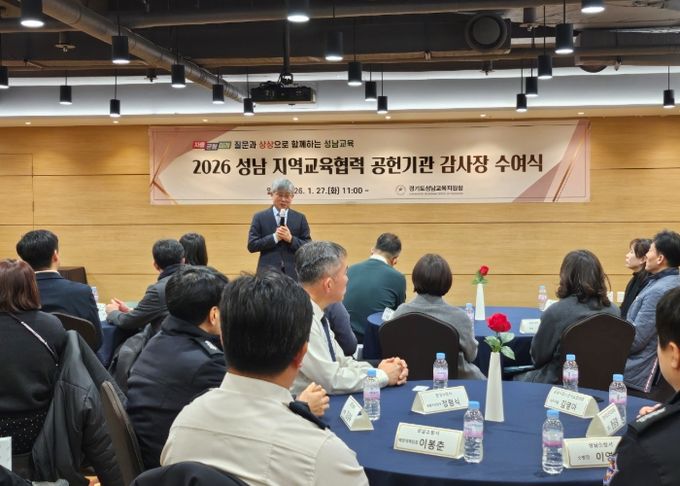 (비전21뉴스) 경기도성남교육지원청은 1월 27일 스카이파크 호텔에서 '성남 지역교육협력 공헌기관 감사장 수여식'을 개최하여 성남교육 발전을 위해 협력해 온 지역교육협력기관 22곳에 감사의 뜻을 전했다.