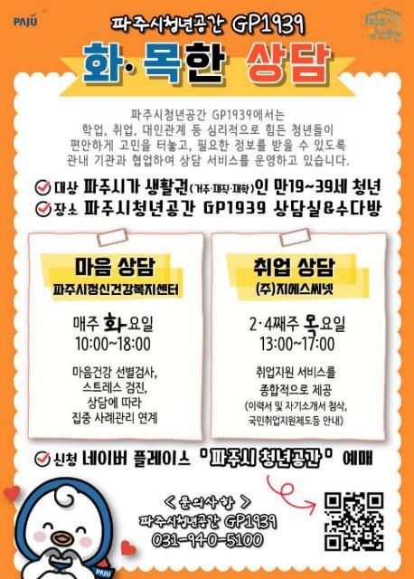 (비전21뉴스) 파주시는 청년들의 심리 안정과 취업 역량 강화를 위해 파주시청년공간 지피(GP)1939에서 진행하는 상담 프로그램 ‘화·목한 상담’의 참여자를 모집한다.