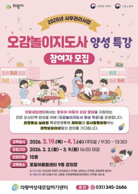 (비전21뉴스) 의왕시 여성새로일하기센터가 '오감놀이지도사 양성 특강'의 교육생을 모집한다.
