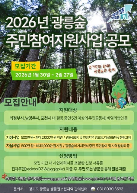 (비전21뉴스) 경기도가 광릉숲 생물권보전지역 활성화를 위해 2026년 광릉숲 주민참여지원사업 참여자를 모집한다.