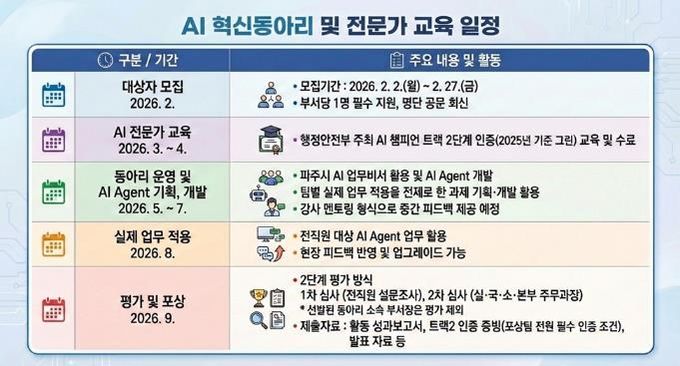 이번 프로젝트의 핵심은 ‘전문성’과 ‘활용성’이다. 참여 직원들은 7명씩 12개 팀으로 나뉘어 활동하며, 행정안전부 주관 ‘인공지능(AI) 챔피언’인증 취득을 목표로 전문 교육을 이수할 계획이다. 각 팀은 부서 특성에 맞춰 실제 업무에 즉시 투입할 수 있는 ‘인공지능(AI) 에이전트’를 직접 기획하고 개발하는 실무 과제를 수행한다.