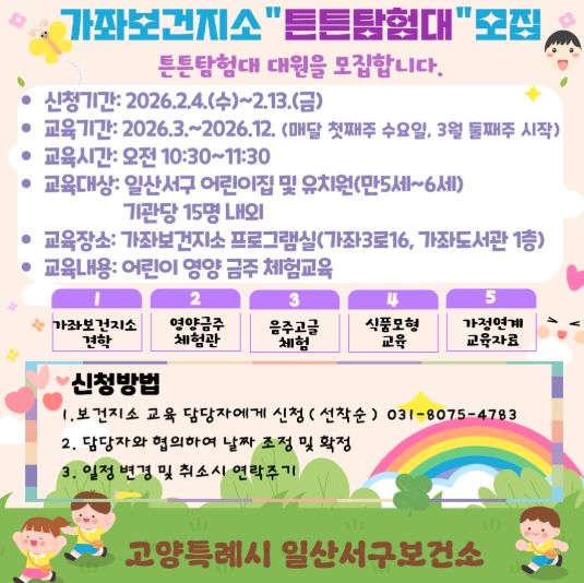 교육 대상은 일산서구 관내 어린이집 및 유치원에 재원 중인 만 5~6세 유아로 기관 당 약 15명 내외가 참여할 수 있다. 교육은 가좌보건지소 프로그램실(가좌3로 16, 가좌도서관 1층)에서 오전 10시 30분부터 11시 30분까지 운영된다.