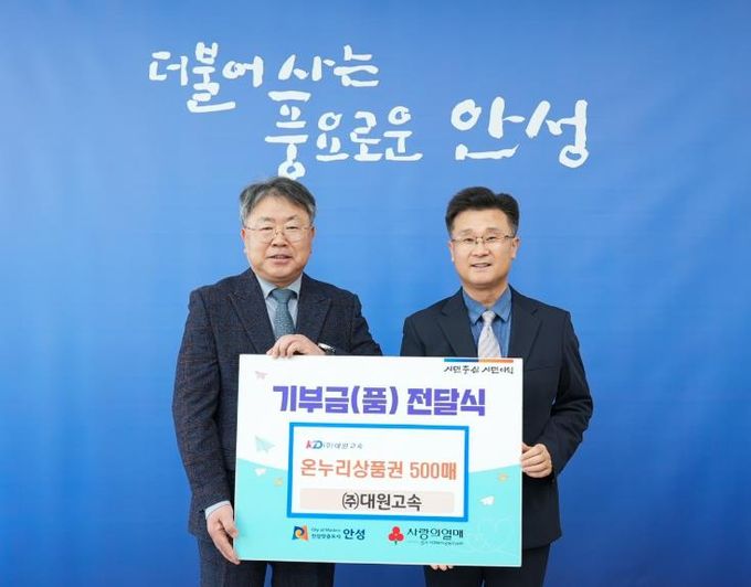 대원고속 관계자는 “안성시의 어려운 이웃들에게 조금이나마 보탬이 되고자 상품권을 준비했다”며 “온누리상품권을 통해 소외된 이웃들에게 실질적인 도움이 되고, 지역 전통시장 활성화에도 기여할 수 있기를 바란다”고 전했다.