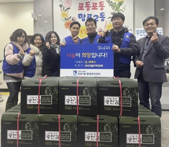 (비전21뉴스) 영통구 망포2동 행정복지센터는 지난 6일 망포2동 바르게살기위원회가 관내 저소득 가정을 지원하기 위해 김 20박스를 기탁했다고 밝혔다.