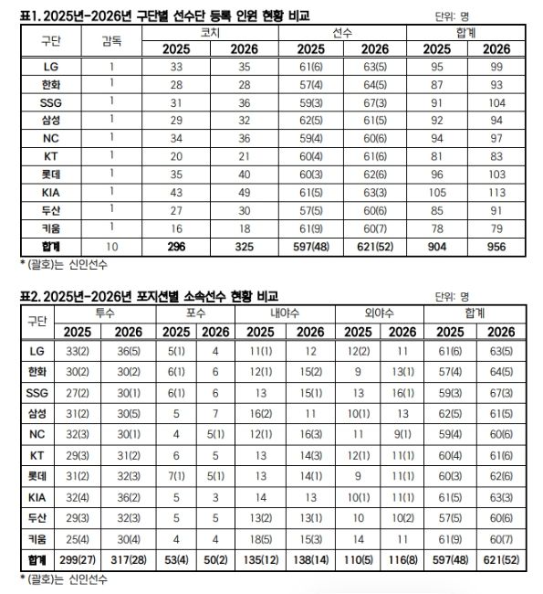 (비전21뉴스) KBO는 2월 10일(화) 2026년 KBO 리그 소속 선수 명단을 공시했다. 10개 구단은 총 621명의 선수를 등록해, 597명이 등록했던 2025년보다 24명이 늘어났다.
