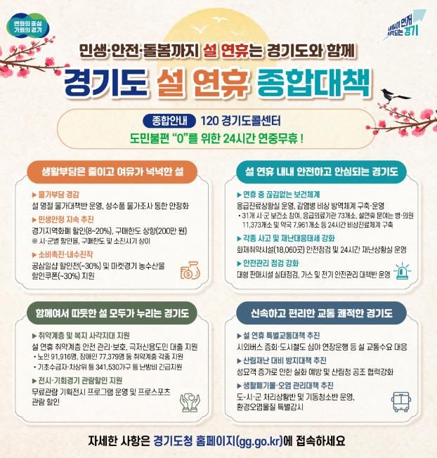 (비전21뉴스) 경기도가 도민들이 따뜻하고 편안한 명절을 보낼 수 있도록 ‘설 연휴 종합대책’을 추진한다.
