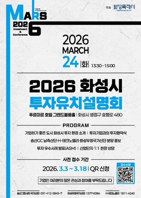 (비전21뉴스) 화성특례시가 오는 3월 24일 푸르미르 호텔에서 ‘2026 화성특례시 투자유치 설명회’를 개최하고, 3월 3일부터 3월 18일까지 QR코드를 통한 사전접수를 진행한다.