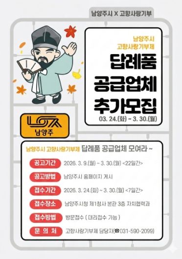(비전21뉴스) 남양주시는 오는 3월 24일부터 고향사랑기부제 참여자들에게 제공할 ‘2026년 고향사랑기부제 답례품 공급업체’ 추가 모집 접수를 시작한다고 6일 밝혔다.