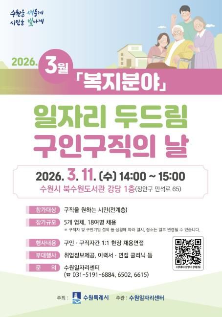 (비전21뉴스) 수원특례시는 3월 11일 오후 2시부터 3시까지 북수원도서관 강당에서 ‘3월 일자리 두드림 구인·구직의 날’을 개최한다.