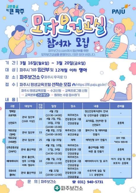 (비전21뉴스) 파주보건소는 건강한 임신과 출산, 행복한 육아를 지원하기 위해 4월부터 운영하는 ‘모자보건 프로그램’참여자를 모집한다.