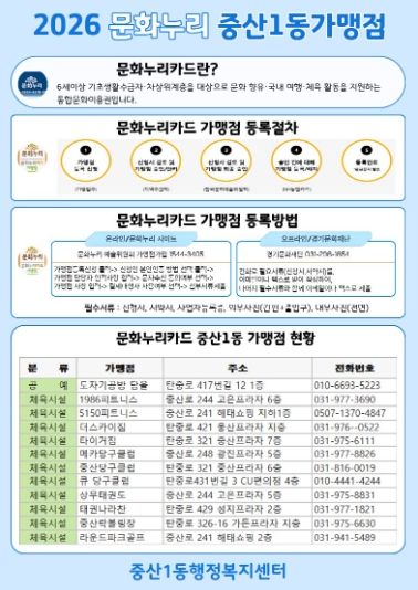 최정원 중산1동장은 “관내 소상공인들에게 문화누리카드 가맹점 등록을 안내해 독거노인, 장애인 등이 가까운 지역에서도 문화누리카드를 사용하는 데 불편을 최소화할 수 있도록 노력하겠다”고 전했다.