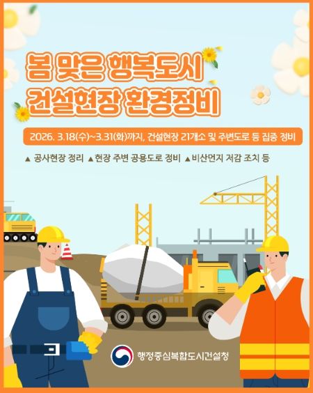 (비전21뉴스) 행정중심복합도시건설청은 3월 18일부터 31일까지 행복청 발주·인허가 건설현장 21개소를 대상으로 봄맞이 환경정비를 실시한다.
