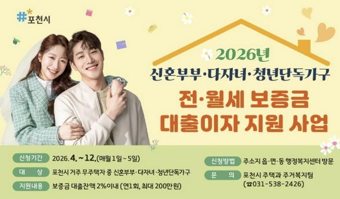 (비전21뉴스) 포천시는 ‘2026년 신혼부부·다자녀·청년가구 전월세 보증금 대출이자 지원사업’을 추진한다.