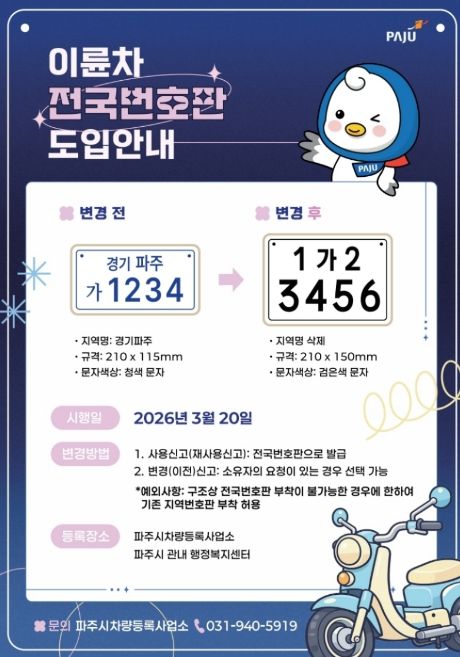 이호명 차량등록사업소장은 “전국번호판 도입으로 이륜차 번호판 식별성이 향상돼 교통법규 준수와 교통안전 확보에 도움이 될 것으로 기대한다”라며 “제도 시행 초기 혼선이 없도록 적극적인 홍보와 안내를 통해 시민 불편을 최소화하겠다”라고 말했다.