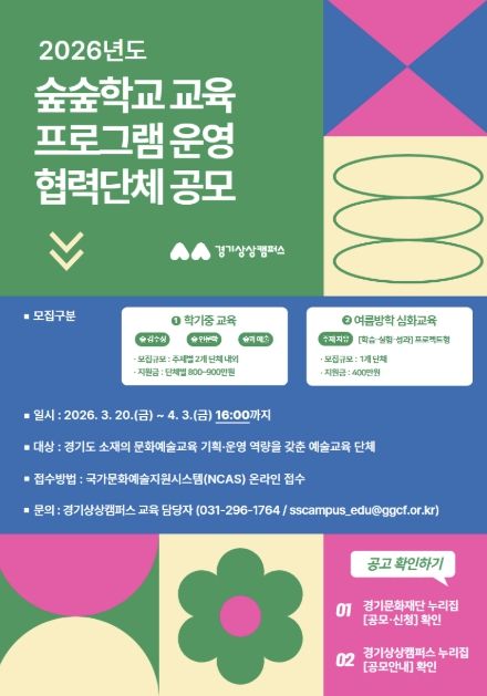 (비전21뉴스) 경기문화재단 경기상상캠퍼스는 3월 20일부터 4월 3일 16시까지 2026 경기상상캠퍼스 ‘숲숲학교’ 교육 협력단체를 공개 모집한다.