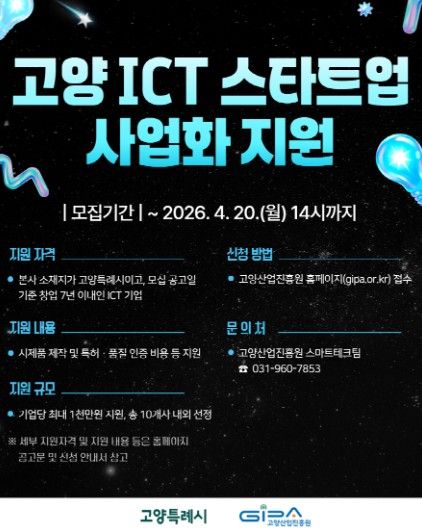 (비전21뉴스) 고양산업진흥원이 ‘2026년 고양 ICT 스타트업 사업화 지원사업’ 참여 기업을 모집한다.