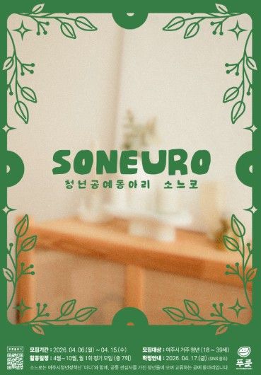 (비전21뉴스) 여주시청년활동지원센터 푸릇은 오는 4월 청년공예동아리 'soneuro(소느로)' 참여자를 모집한다고 밝혔다.