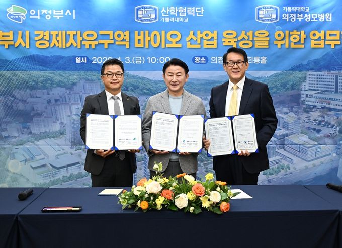 (비전21뉴스) 의정부시는 4월 3일 시청 회룡홀에서 가톨릭대학교 의정부성모병원, 가톨릭대학교 산학협력단과 함께 ‘의정부시 경제자유구역 바이오 산업 육성을 위한 업무협약’을 체결했다.