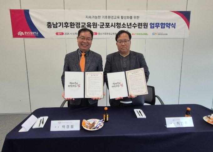 (비전21뉴스) (재)군포시청소년재단이 운영하는 군포시청소년수련원(충남 청양)과 충남기후환경교육원(충남 청양)은 4월 9일, 미래세대의 지속가능 기후환경교육 활성화를 위한 업무협약을 체결했다고 전했다.