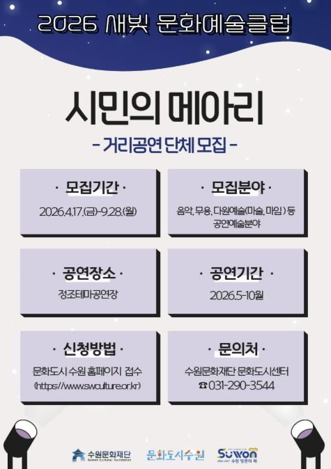 (비전21뉴스) 수원문화재단은 지역 공연예술의 활성화와 수원시민의 주체적 문화예술 참여를 위해 ‘새빛 문화예술클럽 '시민의 메아리'’ 사업에 참여할 생활예술단체를 모집한다.
