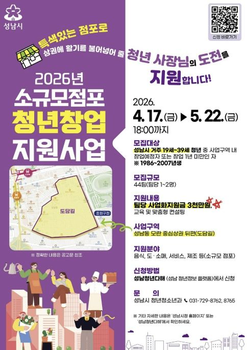 대상은 성남시 거주자이면서 도담길에 창업을 희망하는 19~39세 청년 또는 창업 1년 미만인 청년이다. 신청은 1~2명의 팀 단위로 할 수 있다.