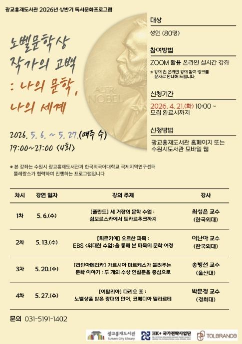 (비전21뉴스) 수원시 광교홍재도서관이 한국외국어대학교와 협력해 진행하는 2026년 세계문화기행 시리즈 1편 ‘노벨문학상 작가의 고백 : 나의 문학, 나의 세계’ 강좌를 수강할 시민을 모집한다.