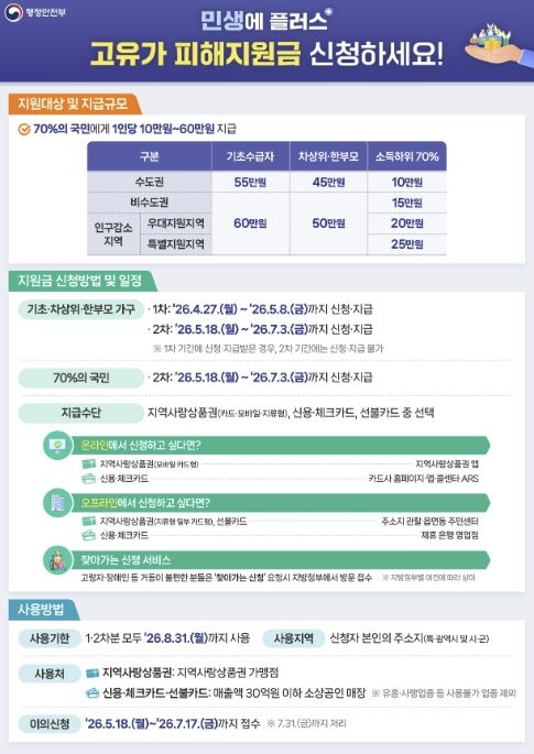 고유가 피해지원금은 지급기준일인 2026년 3월 30일 기준 국내 거주 국민의 70%를 대상으로 지급되며, 군포시는 수도권 기준이 적용된다. 이에 따라 기초생활수급자는 1인당 55만 원, 차상위계층 및 한부모가족은 45만 원, 소득 하위 70%는 10만 원을 지원받게 된다.