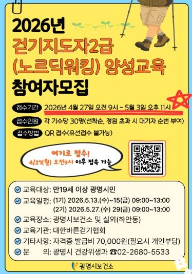 나기효 건강위생과장은 “이번 교육은 단순한 신체 활동을 넘어 시민 건강 회복과 지역사회 건강 공동체 활성화에 기여하는 뜻깊은 기회가 될 것”이라며 “걷기에 관심 있는 시민들의 적극적인 참여를 기대한다”고 밝혔다.