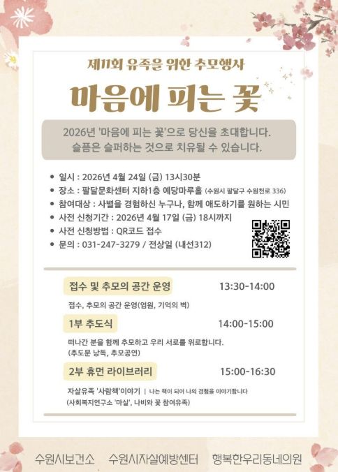 (비전21뉴스) 수원시자살예방센터가 24일 오후 1시 30분 팔달문화센터 예당마루홀에서 유족을 위한 추모행사 ‘제11회 마음에 피는 꽃’을 연다.